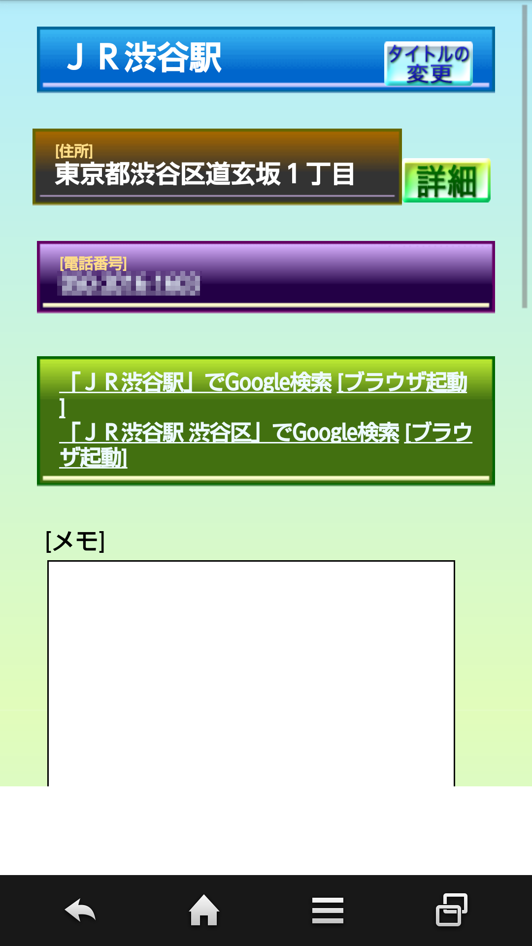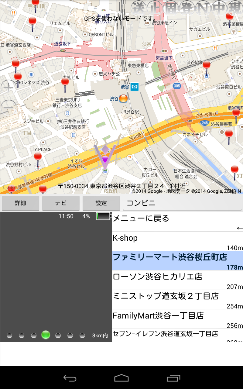 お気に入り場所個別削除方法 〜iOS向けお知らせ〜+++主にiPod touch向けに左下のARビューを表示しないUIを用意しました。シェイクでUIを変更してご利用ください。+++◇◇◇Ver2.7.0より、Place検索にアップルの検索エンジンも使うようにしました。 (結果テーブルビュー下に[G]と出ているのがGoogleでの検索結果、[A]と 出ているのがアップルAPIでの検索結果となっております。) ※※※バージョン2.5.0からの新機能、AR画面に矢印方向ナビ機能が追加されました。目的地の方向がよりわかりやすくなっています。是非ご利用下さい。※※※ ◇◇◇Ver2.4.0より、詳細画面でその場所周辺のクーポンを表示できるようになりました◇◇◇ ◇◇◇Ver2.3.0より、お気に入りの詳細画面でタイトル変更とメモが残せるようになりました◇◇◇ ※iOS 7/iOS 6ではGoogle Maps SDK for iOSによるGoogle Mapのみ、iOS 5ではApple APIによるGoogle Mapのみの地図表示にしました。 ※※※バージョン2.4.1より地図のApple Map表示が復活しました。※※※ ※上部「A」⇔「G」ボタンでApple MapとGoogle Mapを切り替えて変更できます。(iOS 9/8/7/6) iOS 5では全バージョンを通してApple APIによるGoogle Mapのみです。 リストや検索窓からの周辺検索は従来通りGoogleの検索結果となります。 ***Ver2.1.0からの新機能*** 現在地又は検索中心地又は目的地をメールで簡単に送信できる機能が追加されました。上部「送」ボタンをお試しください。 GooglePlaceカテゴリー検索に対応しました。世界言語・地域を問わずにカテゴリーで検索できます。 ※※※バージョン1.5.0からの新機能!※※※ オフラインKML機能が付きました! あらかじめWebから取得したKML形式ファイルによる施設情報を 周辺便利ナビに取り込み、一度取り込んだデータは 参照時にネットに繋がっていなくとも表示することができます! ますます便利になりました! 施設情報は現在地又は検索中心地周辺のものを表示します。 ※ご注意)周辺(緯度経度にて±6度程度)以内に情報が無い場合は 検索結果は0件で表示されません。(遠くにデータがある場合でも 近辺にデータが無ければ表示されません)) KML取り込み直後のKMLファイル内部形式変換中は アプリを終了させないでください。 アプリが終了した場合、変換失敗状態になり、 オフラインKML→KML一覧のリストからタップ後再開しますが、 変換作業は最初からになります。 〜Android向けお知らせ〜アプリ起動後に地図が表示されずに、Google Play開発者サービスのアップデートボタンが表示される場合があります。ボタンに従いGoogle Play開発者サービスのアップデートをしてください。 尚、アップデート直後は周辺便利ナビアプリが一旦強制終了する場合がございますが、仕様です。 以後問題無くご利用頂けます。 Lite版は通常版から「連絡先読み込み機能(個人情報)」「カメラ合成表示(ハードウェアのカメラへのアクセス)」の機能を 削除した機能・権限削減版となっております** ※※※バージョン1.7.0からの新機能、AR画面に矢印方向ナビ機能が追加されました。目的地の方向がよりわかりやすくなっています。是非ご利用下さい。※※※ ◇◇◇Ver1.6.0より、詳細画面でその場所周辺のクーポンを表示できるようになりました◇◇◇ ◇◇◇Ver1.5.0より、お気に入りの詳細画面でタイトル変更とメモが残せるようになりました◇◇◇ ☆☆☆バージョン1.4.0からの新機能!☆☆☆ 現在地又は検索中心地又は目的地をメールで簡単に送信できる機能が追加されました。上部「送」ボタンをお試しください。 GooglePlaceカテゴリー検索に対応しました。世界言語・地域を問わずにカテゴリーで検索できます。 ※※※バージョン1.1.0からの新機能!※※※ オフラインKML機能が付きました! あらかじめWebから取得したKML形式ファイルによるお店・場所情報を ダウンロードしておき、周辺便利ナビに取り込み、一度取り込んだデータは 参照時にネットに繋がっていなくとも表示することができます! ますます便利になりました! オフラインで地図が表示されなくてもGPS・現在地・移動履歴・方角・コンパス・距離で目的地に着けるかもしれません。 (※SDカードへの書き込み権限が追加されました(KMLをSDカードに保存する為)) ◆◆◆ おすすめの使い方 ◆◆◆ 検索窓からワード入力またはメニューから検索 詳細をタップしてお店の確認 良い・行きたいと思ったらお気に入り場所に登録 お気に入り場所から呼び出して行きたいお店を選択状態にし、そのまま周辺便利ナビの地図を使うor ナビボタンでGoogleナビを呼び出して目的地へ ◇移動中にバッテリを節約したい場合は地図を確認したらこまめにホームボタンでアプリをバックグラウンドにしてください◇ --- アプリの説明 ---「周辺便利ナビ」は周辺情報をわかりやすく直感的に表示して目的地へ簡単便利にたどり着くことをサポートするナビゲーションアプリです。 GPSで取得した現在地の周辺の店や施設を簡単に検索できます。 現在地以外でも任意の場所周辺もあらかじめ検索できま